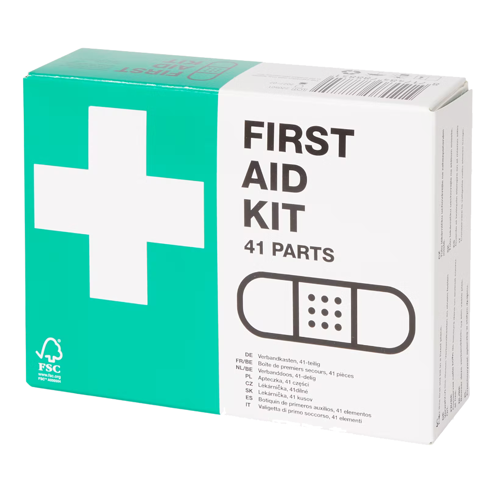 Poręczna apteczka pierwszej pomocy składająca się z 41 części. Apteczka wyposażona została tak, aby móc szybko udzielić pierwszej pomocy w przypadku drobnych wypadków w domu lub poza nim.