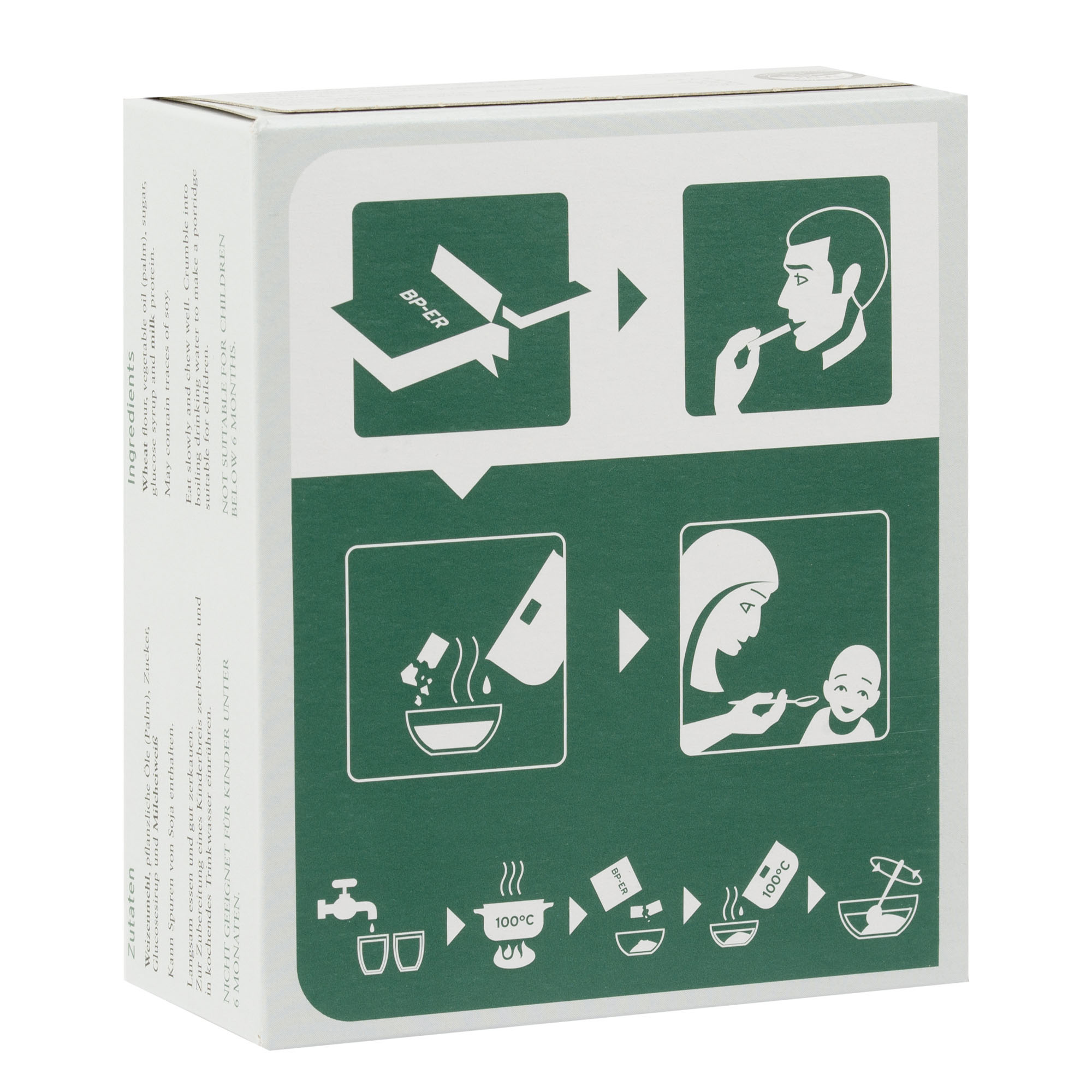 Racja żywnościowa zawiera 9 batonów, przypominających herbatniki proteinowe. Batony są pakowane próżniowo, w grubą, odporną czynniki zewnętrzne i gryzonie folię. BP-ER często jest podstawowym wyposażeniem spotykanym przy pierwszej fazie niesienia pomocy humanitarnej w razie katastrof, także do zabezpieczania się na sytuacje awaryjne.